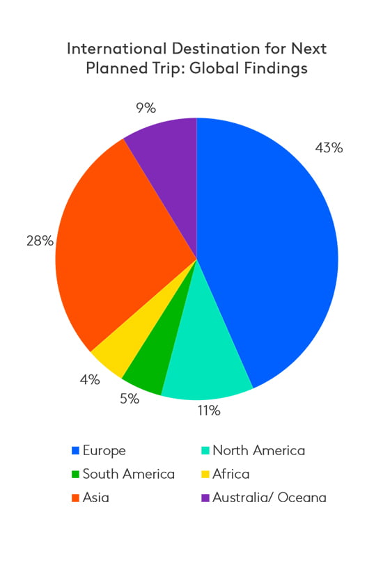 Of the 26% of people who report to have international travel plans, 43% say their next trip will be to a European destination and 28% say they plan for a holiday in Asia.