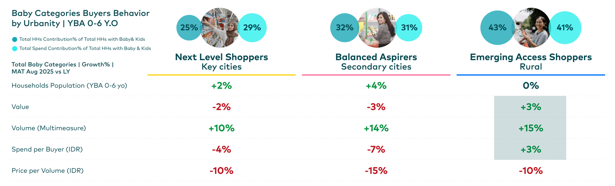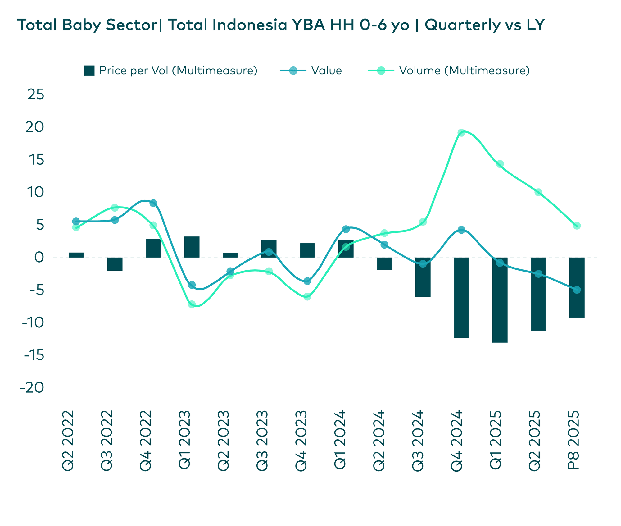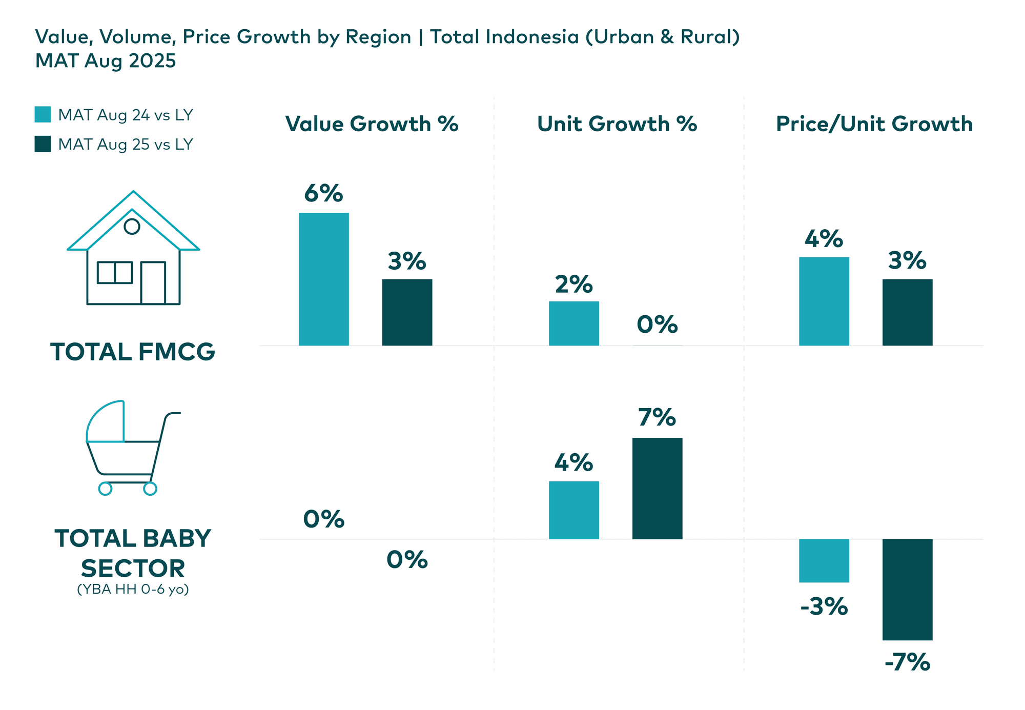 Despite modest growth of 3% across Indonesia’s FMCG sector, the baby care category is facing a paradox: consumption is rising, yet value remains stagnant. This disconnect is driven by continuous downtrading, with shoppers opting for lower-priced alternatives to their usual brands – resulting in flat growth in spend. Having been prominent since the second half of 2024, this trend has become more pronounced in the most recent period.