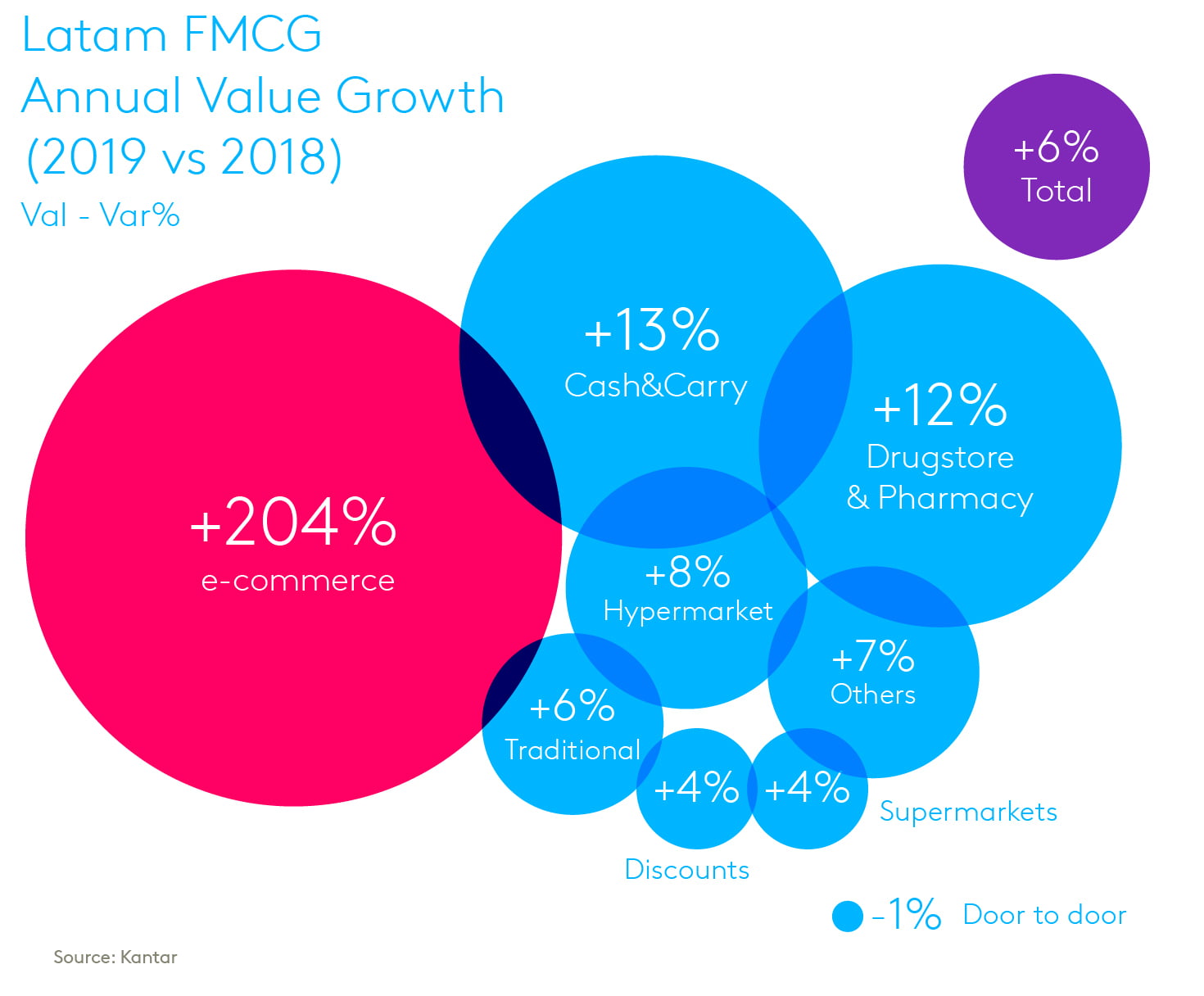 E-Commerce (+204%), Wholesalers (13%) and Drugstores (12%) with 2-digit growth over 2018. (CI LATAM Q4 2019).