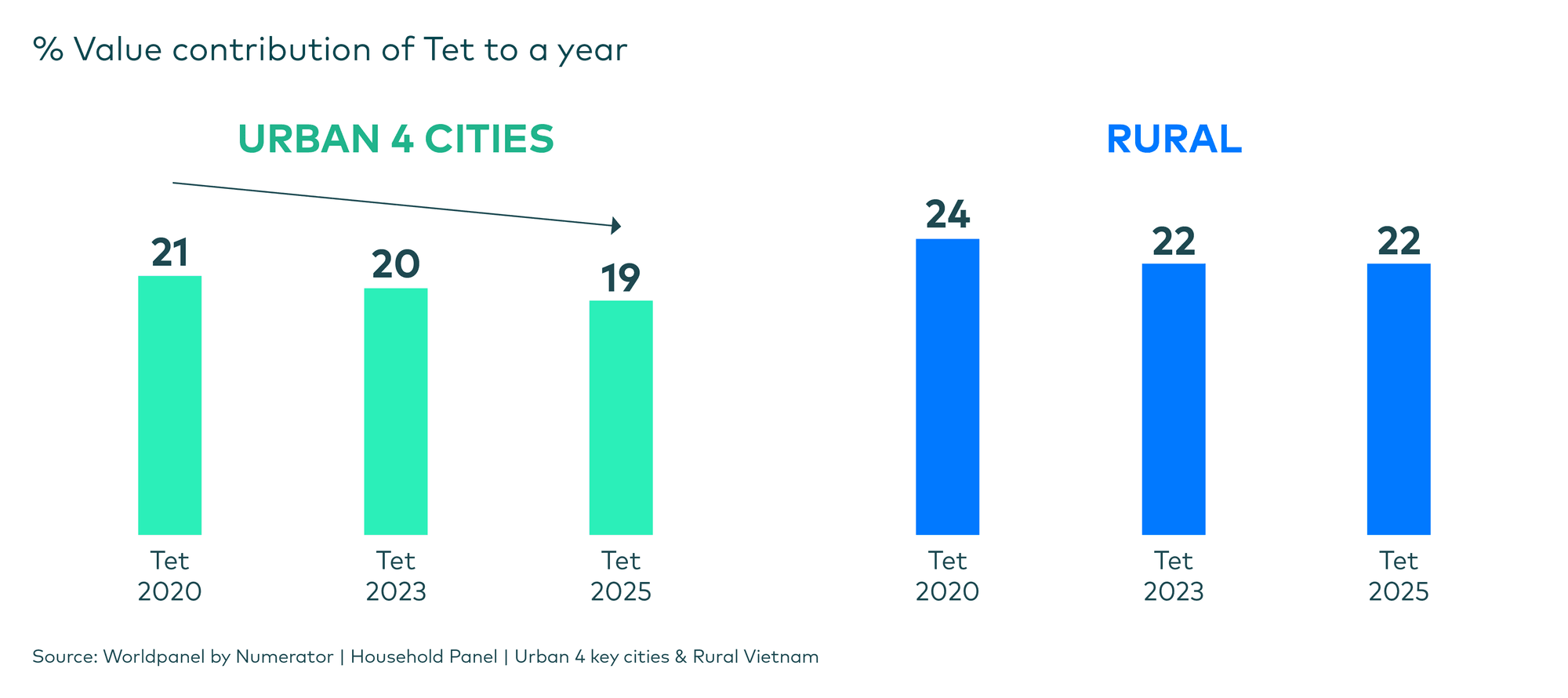 Despite the positive growth rebound in 2025, the overall value contribution of the Tet season to annual FMCG value is showing a declining long-run trend in both regions. with Urban 4 value contribution dipping from 21% in 2020 to 19% in Tet 2025 and Rural dropping from 24% in Tet 2020 to 22% in Tet 2025.