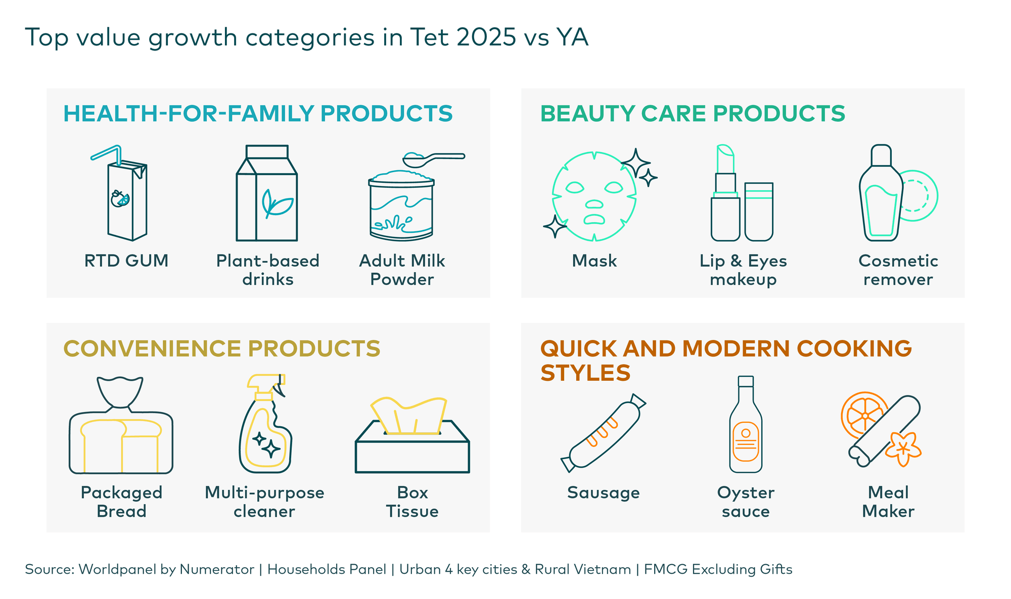Hand-in-hand with convenience is the heightened focus on health and prioritisation of self-care. Prompted by a general rise in health consciousness, and a desire to make the holiday a true period of renewal, consumers are making more discerning choices. This trend is powerfully evident in the growth of crucial health categories such as plant-based beverages and adult milk powder. Furthermore, personal care categories are surging, driven by products that allow consumers to feel their "best-self-but-better" throughout the holiday such as masks and makeup. This demonstrates that Tet is increasingly viewed not just as a time for external celebration, but for internal well-being and personal reset.