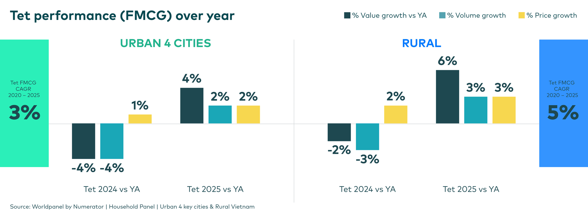 After a subdued Tet 2024 marked by economic headwinds and consumer caution, which saw overall FMCG decline, the Tet 2025 season delivered a much-needed recovery. FMCG purchases in Urban 4 cities showed a slight recovery with 4% value growth and rural markets showed a steady growth of 6% in value, in both regions driven equally by slight increases in price and volume.