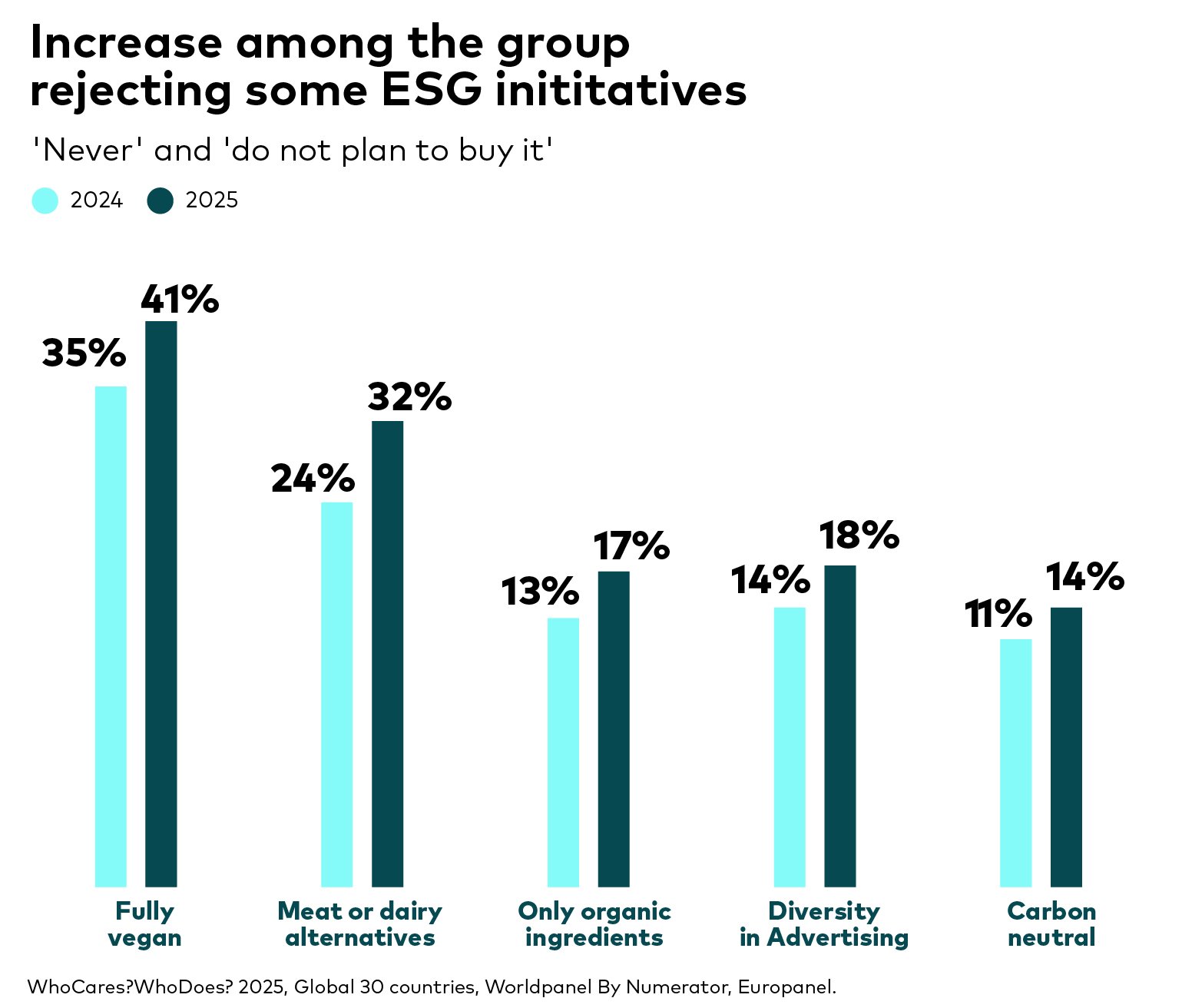 Interestingly, this year we saw a higher percentage of people saying they would never look for vegan products (41% up from 35% in 2024) or meat and dairy alternatives (32% up from 24%) with a particular impact in countries such as UK and Ireland, Spain, South Africa and France. The fact the plant milk category is still in growth despite a political backlash shows you can continue to build a base and not every single person needs to be converted to grow.