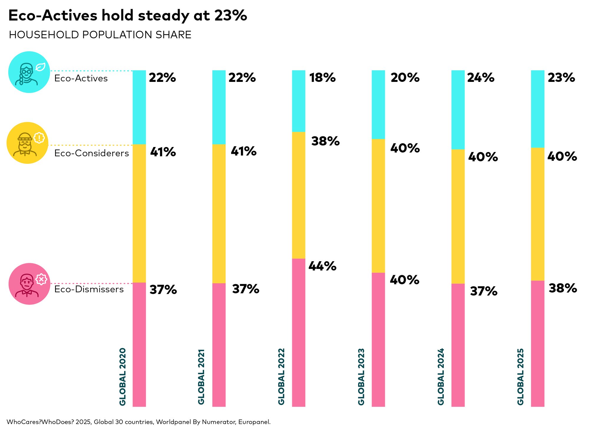 So far, 2025 has yet to provide a significant breakthrough: the global government treaty on plastic is collapsing, European Union (EU) initiatives stalling and the US taking steps backwards. As a result, we have seen the proportion of Eco-Actives staying largely the same with only a small drop 1% to 23% in 2025. Eco-Considerers are static at 40%, the same proportion as in 2023 and 2024, with a rise in Eco-Dismissers, up one point at 38%.