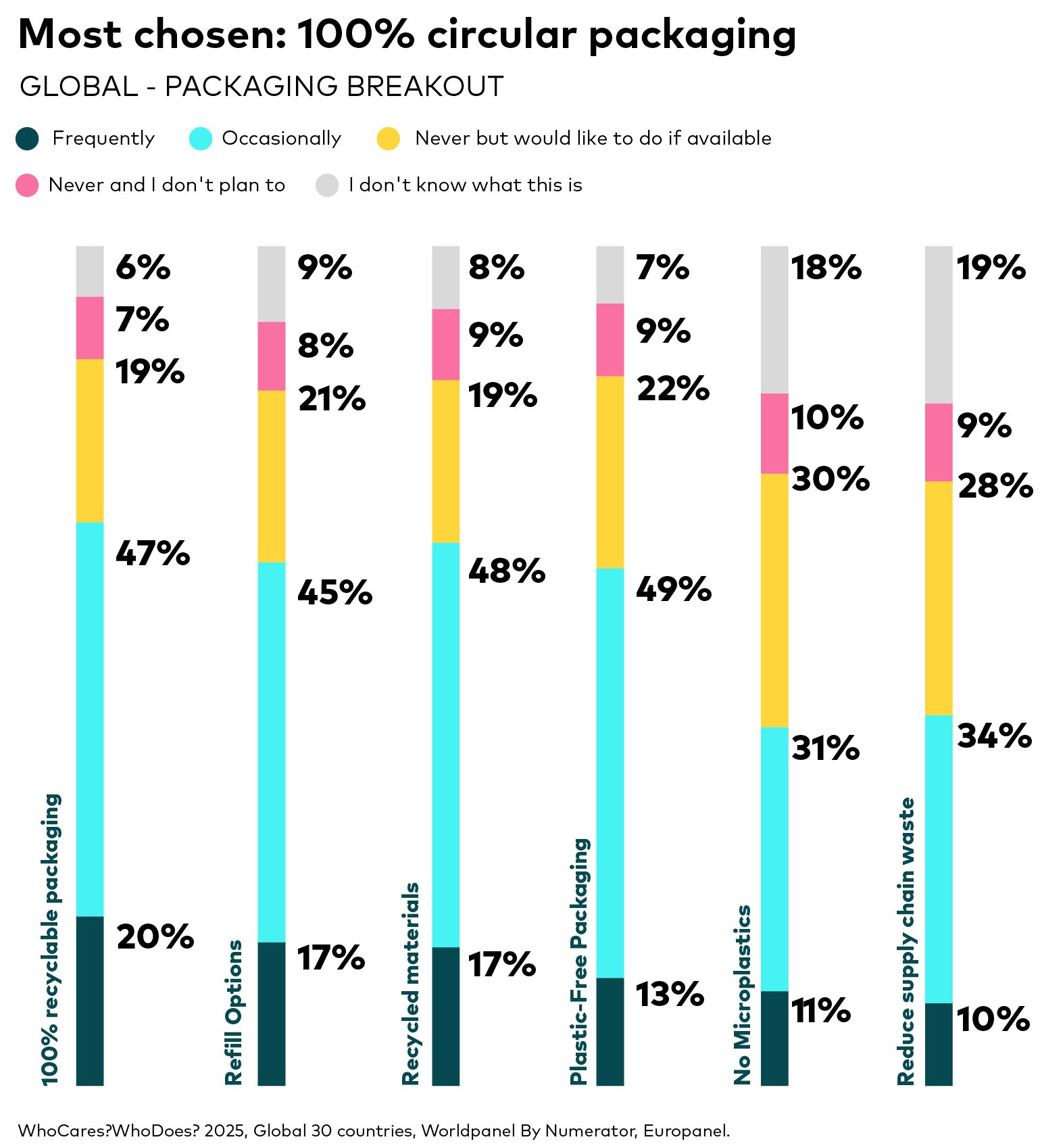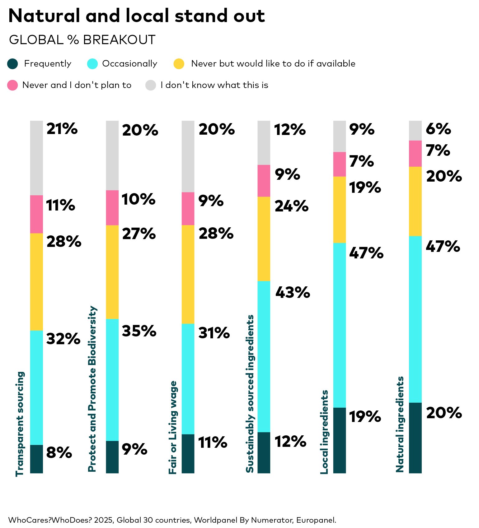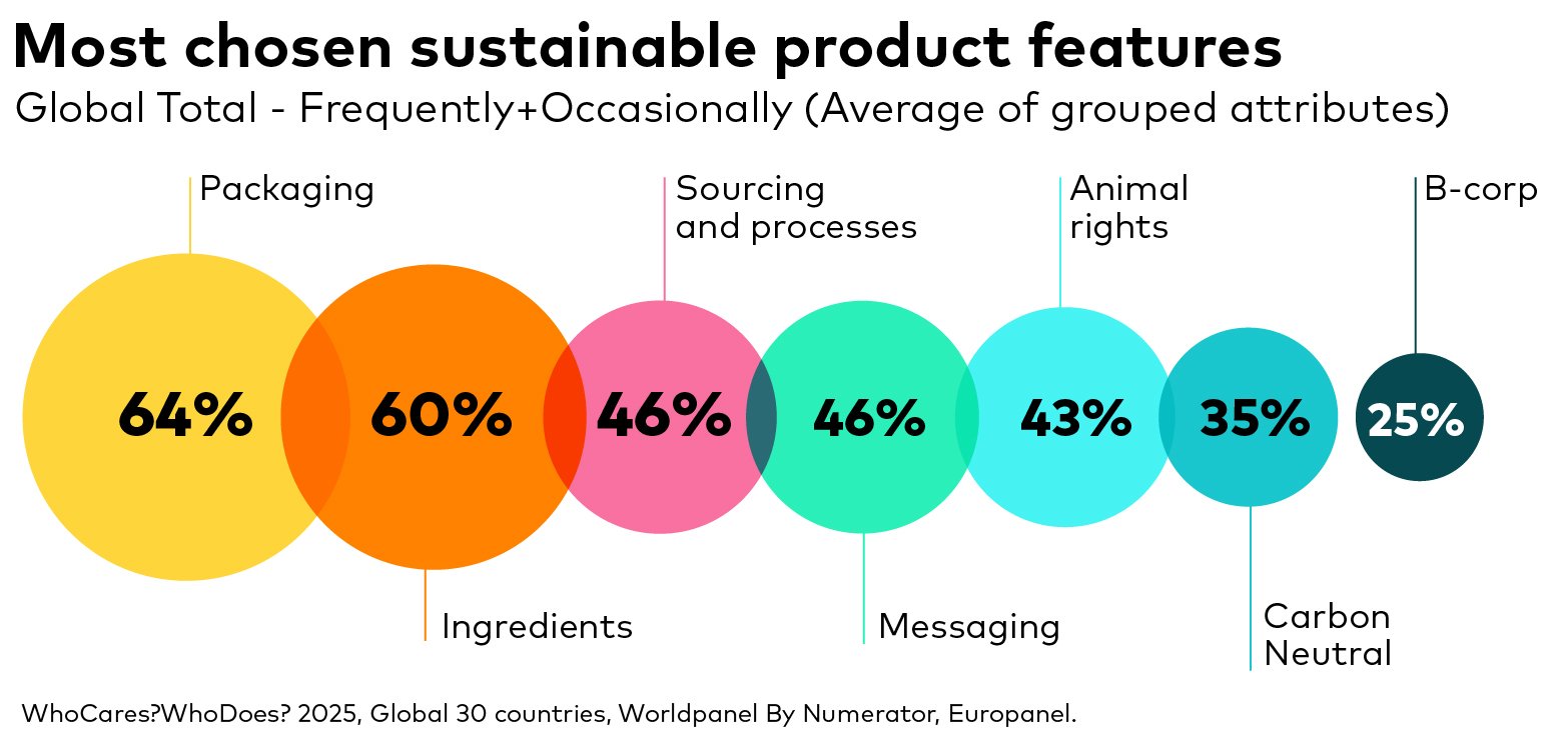 Packaging is the most frequently mentioned area in our study: 64% of respondents indicated a preference for products with packaging that minimises landfill impact. The next most significant purchase driver pertains to ingredients, with natural and local attributes standing out. Meanwhile, concepts like Carbon Neutral and B-Corp certification remain relatively unfamiliar to many people.