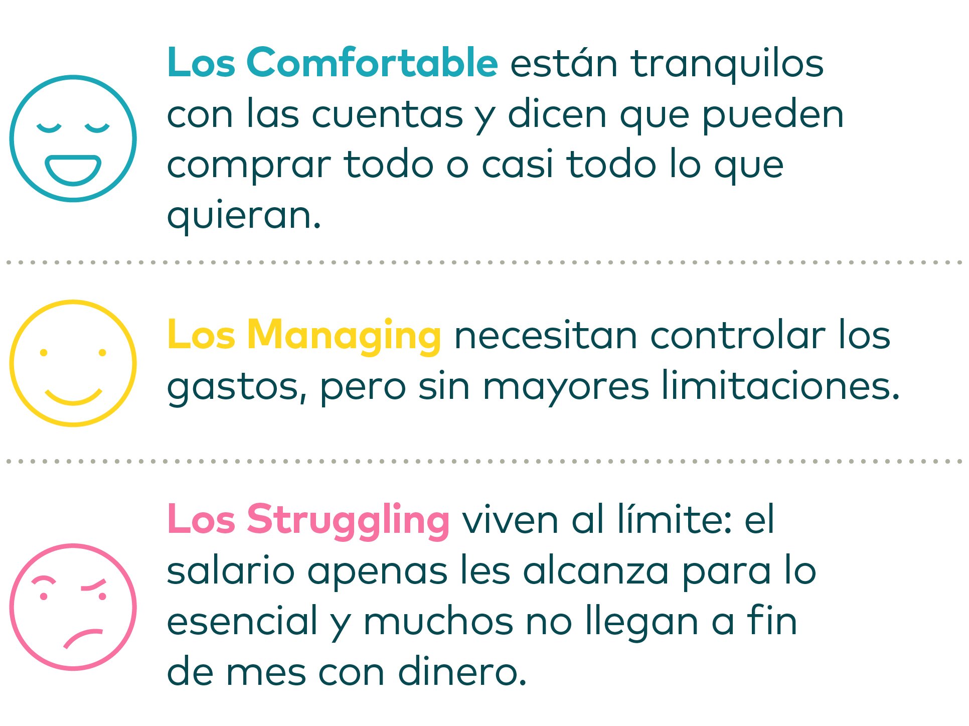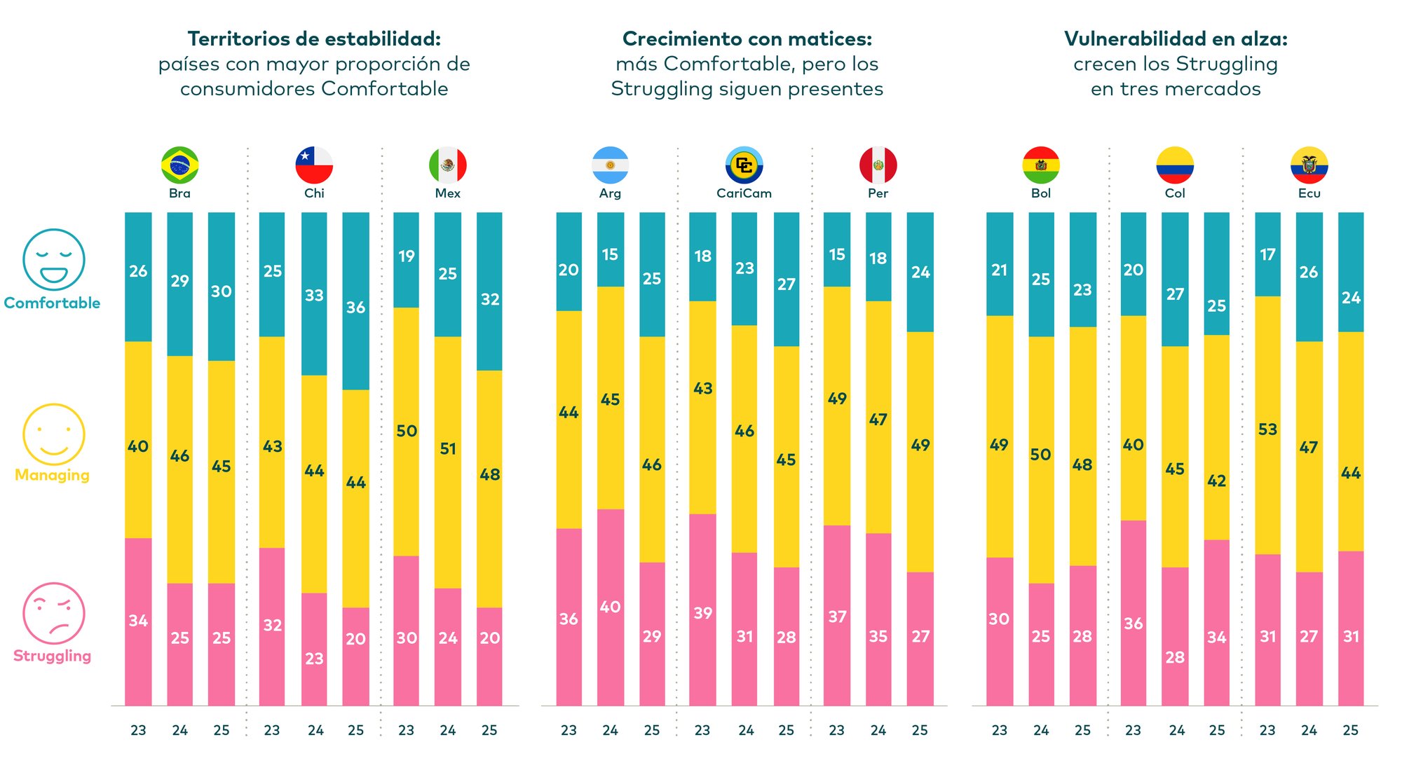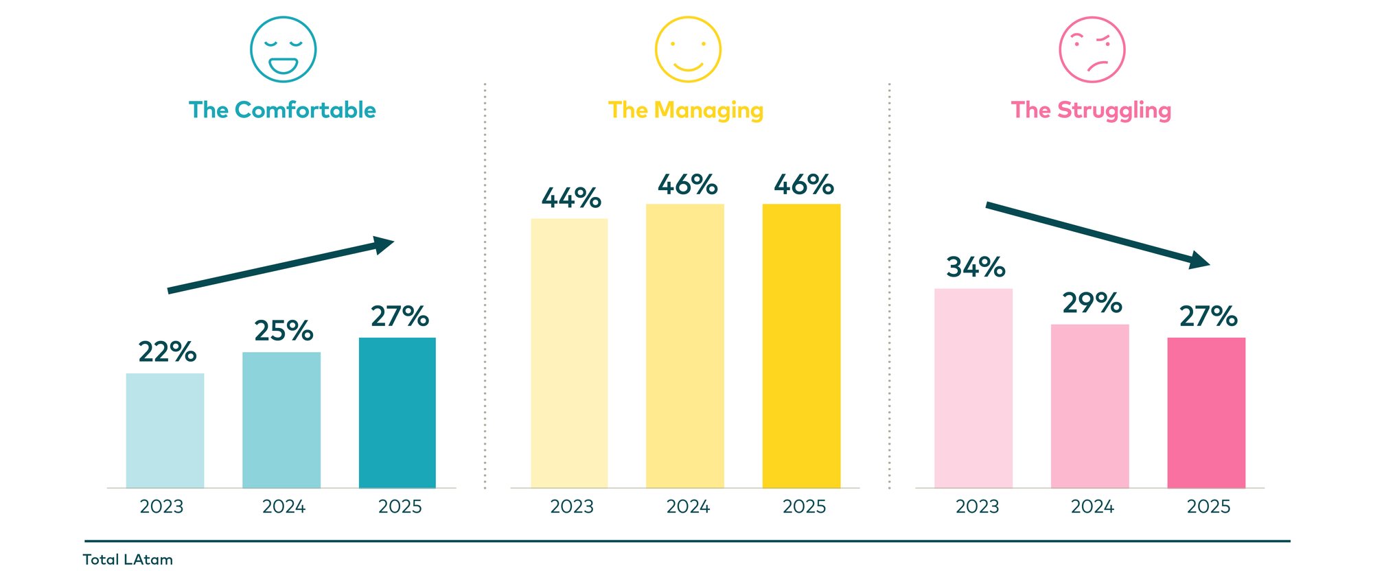 El primero está formado por México, Chile y Brasil, que tienen personas más cómodas que luchando. Aquí, hay un mayor crecimiento en comparación con los Comfortable en México (de 25% en 2024 a 32% en 2025) y Chile (de 33% a 36%). Brasil, a su vez, se mantiene estable (del 29% al 30%).