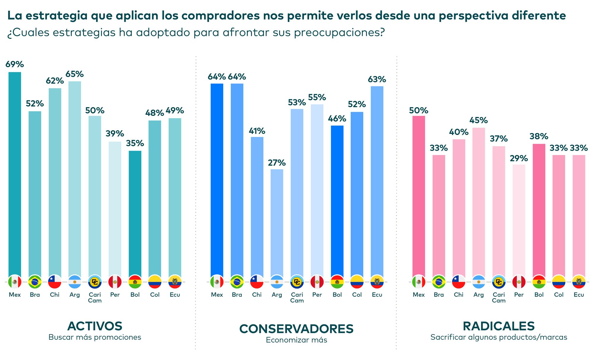 En la práctica, en los países con más consumidores en una situación difícil – Bolivia, Colombia y Ecuador – la estrategia más común es ahorrar tanto como sea posible. Donde hay gente más cómoda – México, Chile y Brasil – lo que se ve son clientes activos, a la caza de promociones y tratando de hacer una compra "más inteligente".